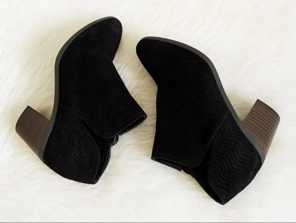 Lucky Brand sz 7.5 Womens Black detailed suede leather Chunky wooden Heel Zip Up Ankle Booties Fall... Show more