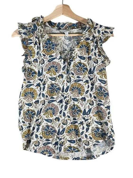 Lucky Brand Womens Blue Creme VTG Y2K Style Floral Boho Indie Ruffled Top Sz M Great Pre-Owned Cond... Show more