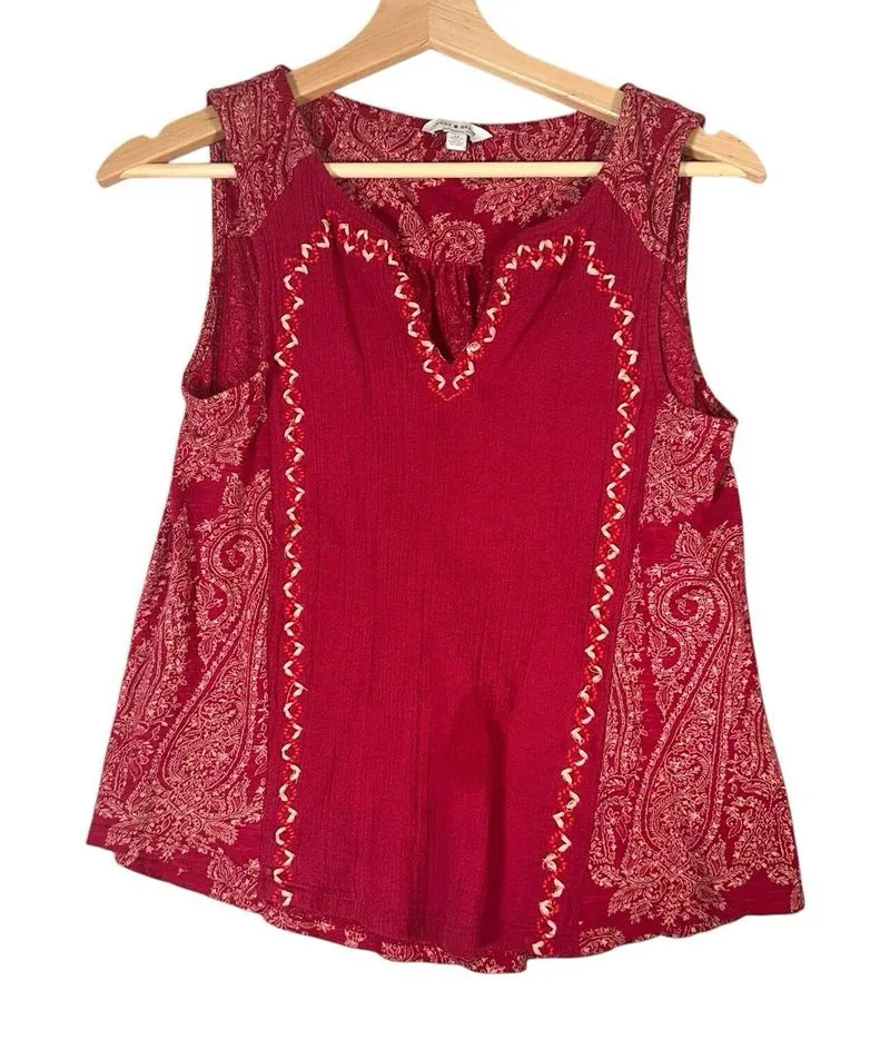 Lucky Brand Womens Red Tan Boho Indie Western Embroidered Woven Mix Top Sz M Great Pre-Owned Condit... Show more