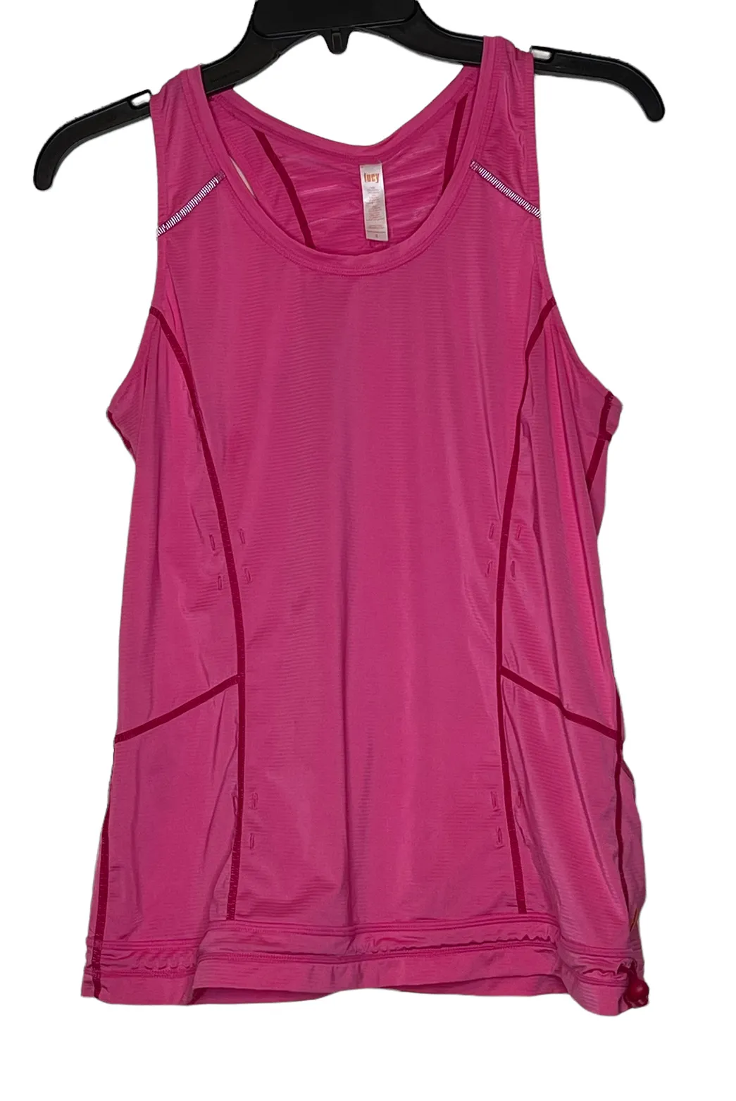 Good condition Brand- Lucy Material- 81% Polyester/19% Spandex Size- Small Color- Pink Striped Measurements: Armpit to armpit- Under the arm measurement- 17" Shoulder to shoulder- Shoulder seam to shoulder seam- 10.5" Length- From bottom of collar to the end of the top- 22"
