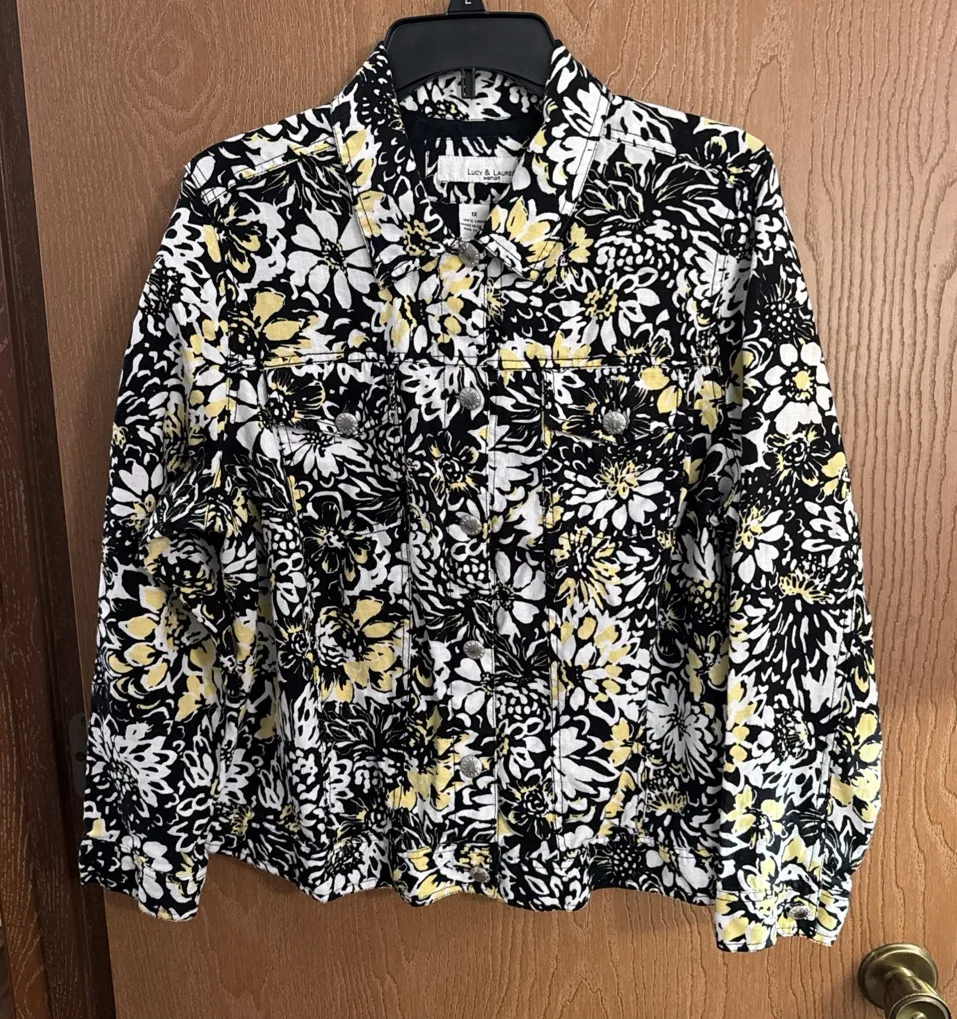 Approximate measurements Pit to pit: 23” Shoulder to hem: 24” Sleeve: 23” at top Elegant floral jacket by Lucy & Laurel. Crafted from pure linen. Features black, white, and yellow floral design.