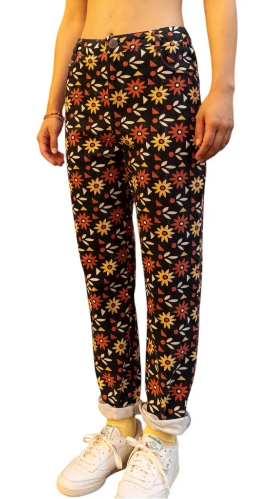 Vibrant floral jeans with a comfortable fit. Perfect for casual outings. Features Belt loops 5-pocket High rise Button and zipper closure Size: W28/R Color: Black floral Material: 100% Organic Cotton Waist: 14.5 in Rise: 11 in Inseam: 18.5 in Measurements are proximate laying down flat