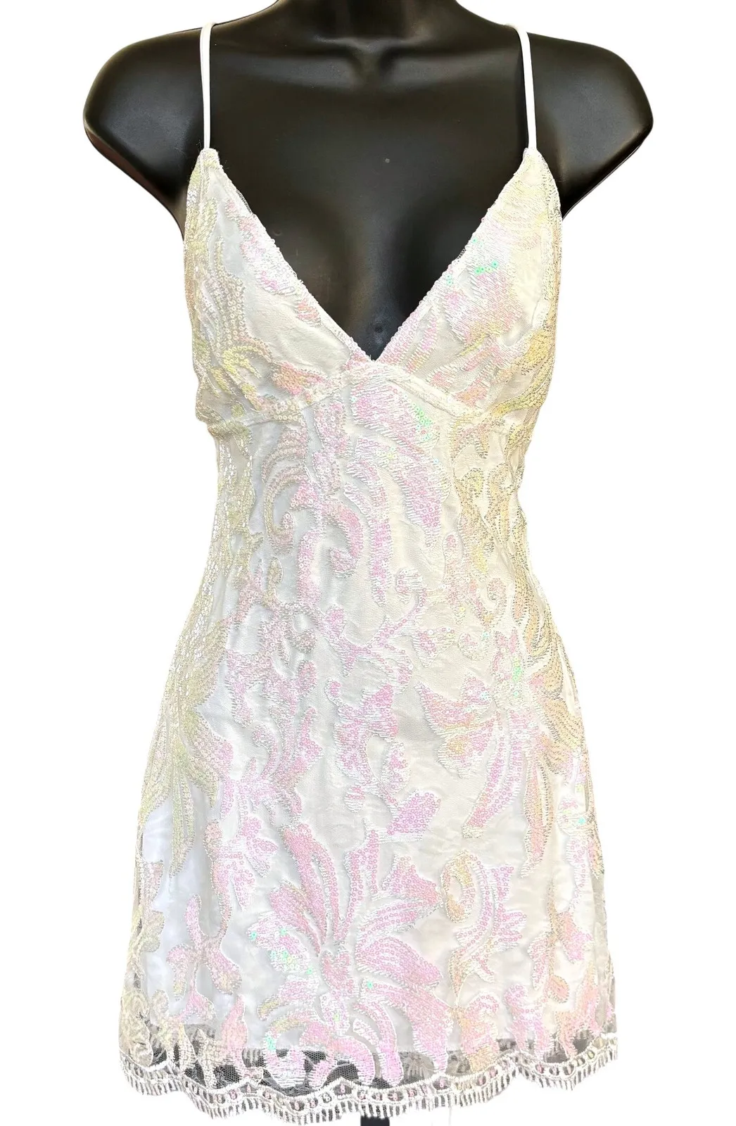 Lucy In the Sky Clarabelle Iridescent Sequin Mini Dress Size S White with lacy overlay and iridesc... Show more