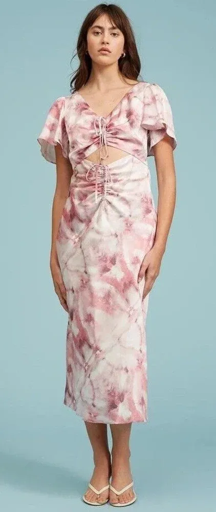 Lucy Paris Pink Tie Fye Drawstring Cutout Front Midriff Midi Length Dress Smocked Back Short Flutter Sleeves V-Neck Women's Size XS. NWT, New with Tags Approx measurements laid flat Pit to pit: 15 inches Full length: 52 inches