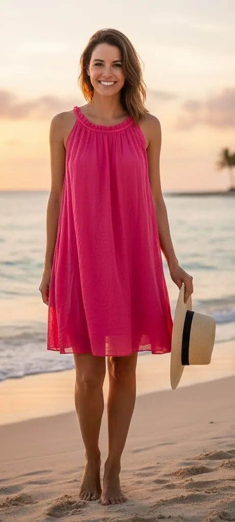 Radiate effortless charm in this vibrant pink halter dress. The flowy silhouette and delicate ruffle neckline create a flattering and feminine look, perfect for embracing warm weather. The lightweight silk fabric drapes beautifully, offering a luxurious feel against your skin. Imagine yourself strolling along the beach or enjoying a sunset cocktail in this exquisite piece. Ideal for beach vacations, resort getaways, or elegant summer evenings. Flawed and Preowned Condition. Holes located in the back of the dress pointed out in the photo. Please check photos to approve condition. Note: The photo featuring a model is AI-generated for reference and may not be an exact depiction of the item. All other photos are of the actual item you will receive. Fast shipping from Florida! **item has the original tags attached, however it does not come directly from the retailer and was thrifted ***please note this dress is flawed Style: Sundress, Trapeze & Swing, Shift Dress Length: Short Department: Women Sleeve Length: Sleeveless Pattern: Solid Occasion: Casual, Travel Material: 100% Silk, Viscose, Elastane Fabric Type: Rayon Theme: Peasant, Colorful Neckline: Halter Season: Summer Sleeve Type: Strapless Closure: Pullover Accents: Ruffle Keywords: halter dress, silk dress, ruffle neckline, pink dress, resort wear, beach dress, vacation dress, summer dress, Italian fashion, lightweight dress, flowy dress, designer dress