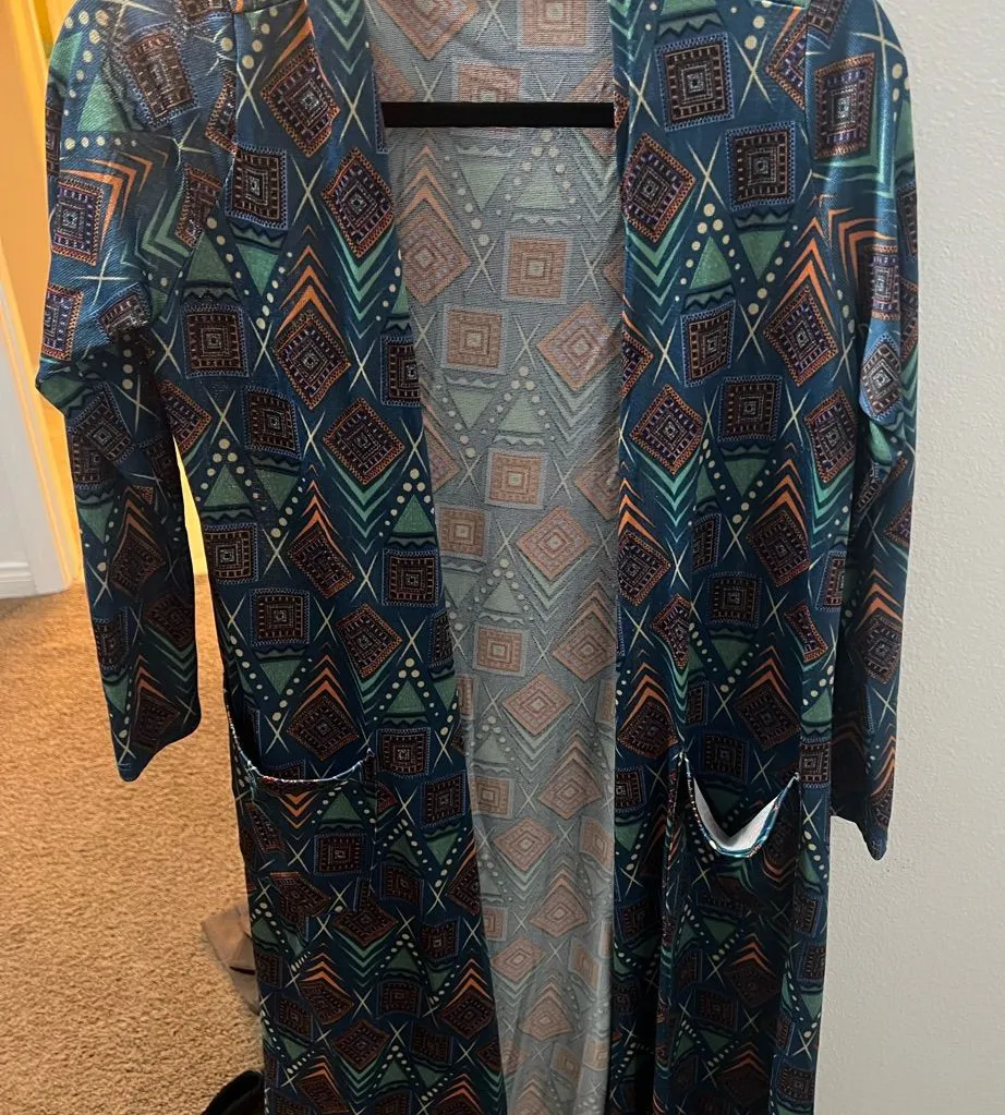 Stylish long kimono with a geometric pattern. Features blue, orange, and green colors. Perfect for l... Show more