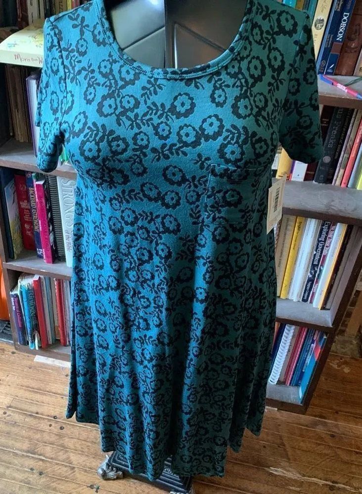 Lularoe green floral, heavier fabric, knit, comfortable, high low hem dress. Front pocket. Travels w... Show more