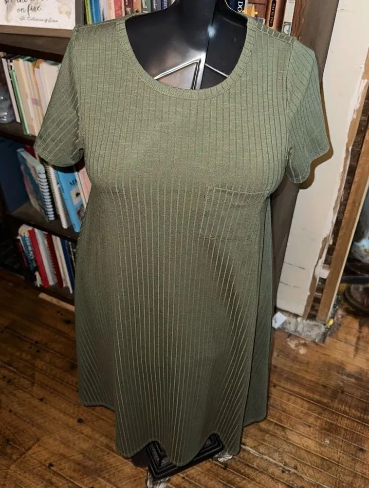 Lularoe olive green, high low, comfortable, knit dress. Comfortable and travels well. Pair with a be... Show more