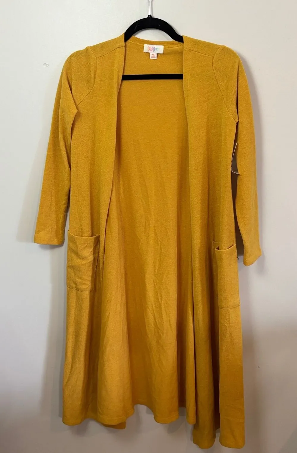 Keywords: LuLaRoe Sarah Cardigan, Duster Cardigan, Long Cardigan, Yellow Cardigan, Knit Cardigan, Womens Cardigan, Casual Cardigan, Layering Cardigan, Sweater Cardigan, Mustard Yellow, XS, New with Tags