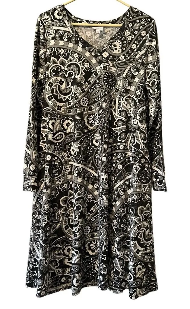 This dress is preowned and in great used condition! Lularoe Swing Dress Long Black White Paisley... Show more