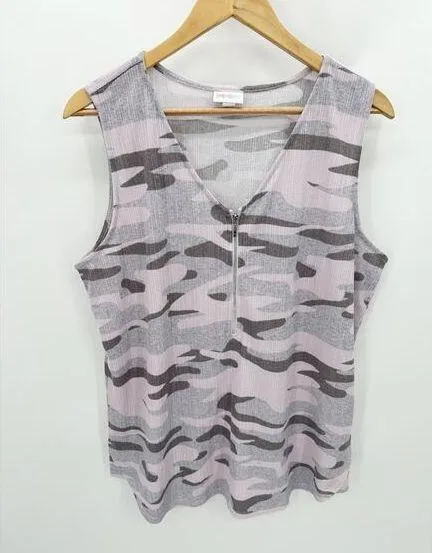 Pink, purple, and grey camo print v-neck front zip tank top. Size: Large (L) Condition: Pre-owned... Show more