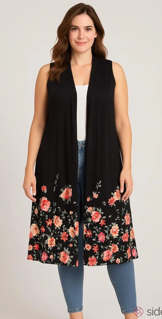 LuLaRoe Womens Vest Sz S Joy Long Black Peach Red Green White Duster Floral GENERALLY SHIP SAME OR... Show more