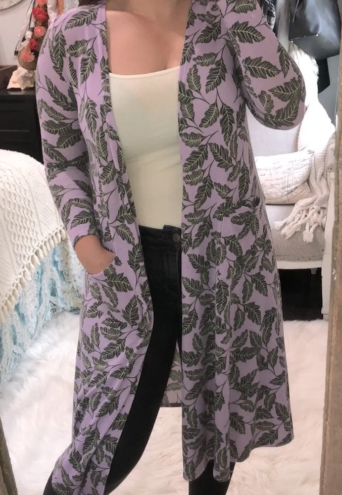 LulaRoe size xsmall purple leaves print foster cardigan Front pockets Rain Snow Winter Puffer Sk... Show more