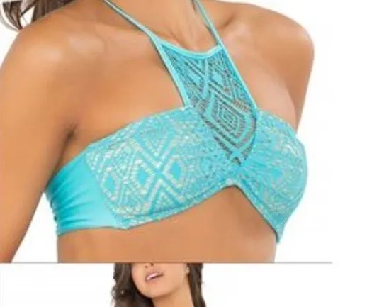 Good pre-loved condition see photos *V- insert Lace detail *Bandeau top with neck and back ties *Soft removable padding *Neck tie can be brought down for tanning Color is Aruba Blue