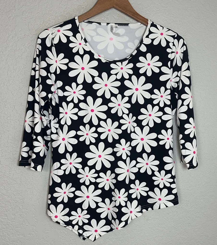 Lulu-B Black White Daisy Top Size small Like new! Excellent condition Asymmetrical hem Stretchy nylon UPF 50 Length shoulder to longest point 28”, to side 24” Black and white and pink Spring Vacation Resortwear I ship fast