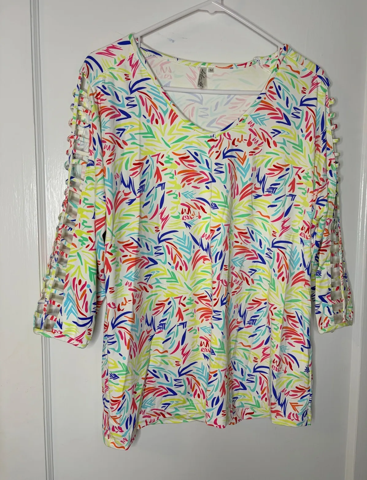 Measurements: • Bust: 24 in • Length: 26 in Type: T-Shirt Department: Women Style: Tunic Material: Nylon, Spandex Neckline: V-Neck Sleeve Length: 3/4 Sleeve Sleeve Type: Slit Sleeve Pattern: Floral Accents: Strap Theme: Colorful Features: Lightweight, Stretch Fit: Regular Fabric Type: Knit Occasion: Casual Closure: Pullover Season: Spring, Summer Unit Type: Unit Keywords: tropical print, leaf print, cut out sleeves, v neck, bright colors, summer top, vacation wear, resort wear, casual top, women's fashion, colorful, feminine HH-498