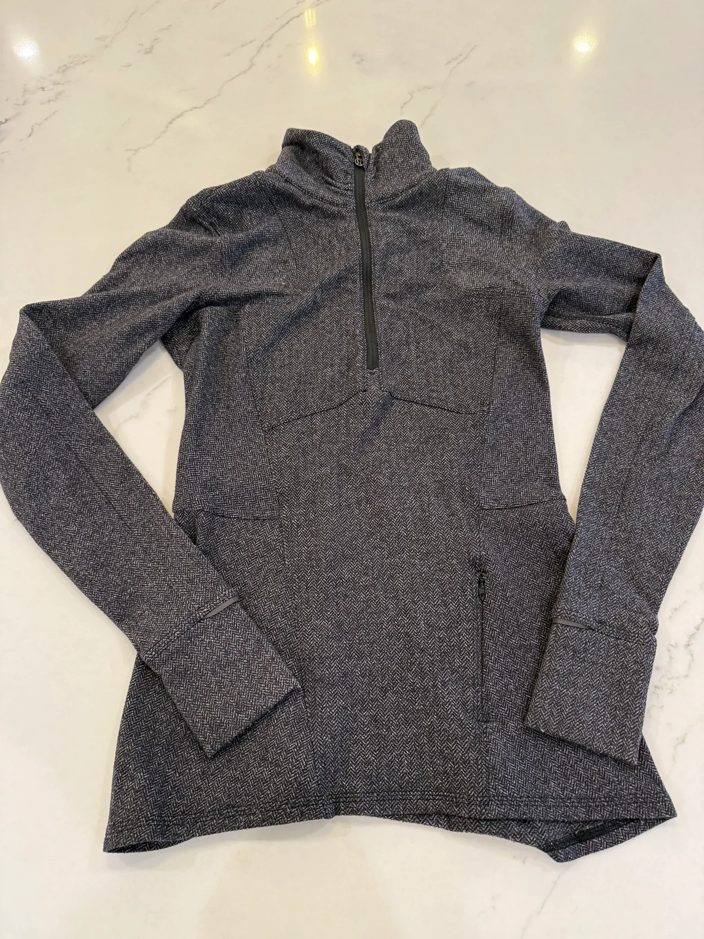 Grey, slim fit. Thumb holes. Zipper pocket in front. Thick material.