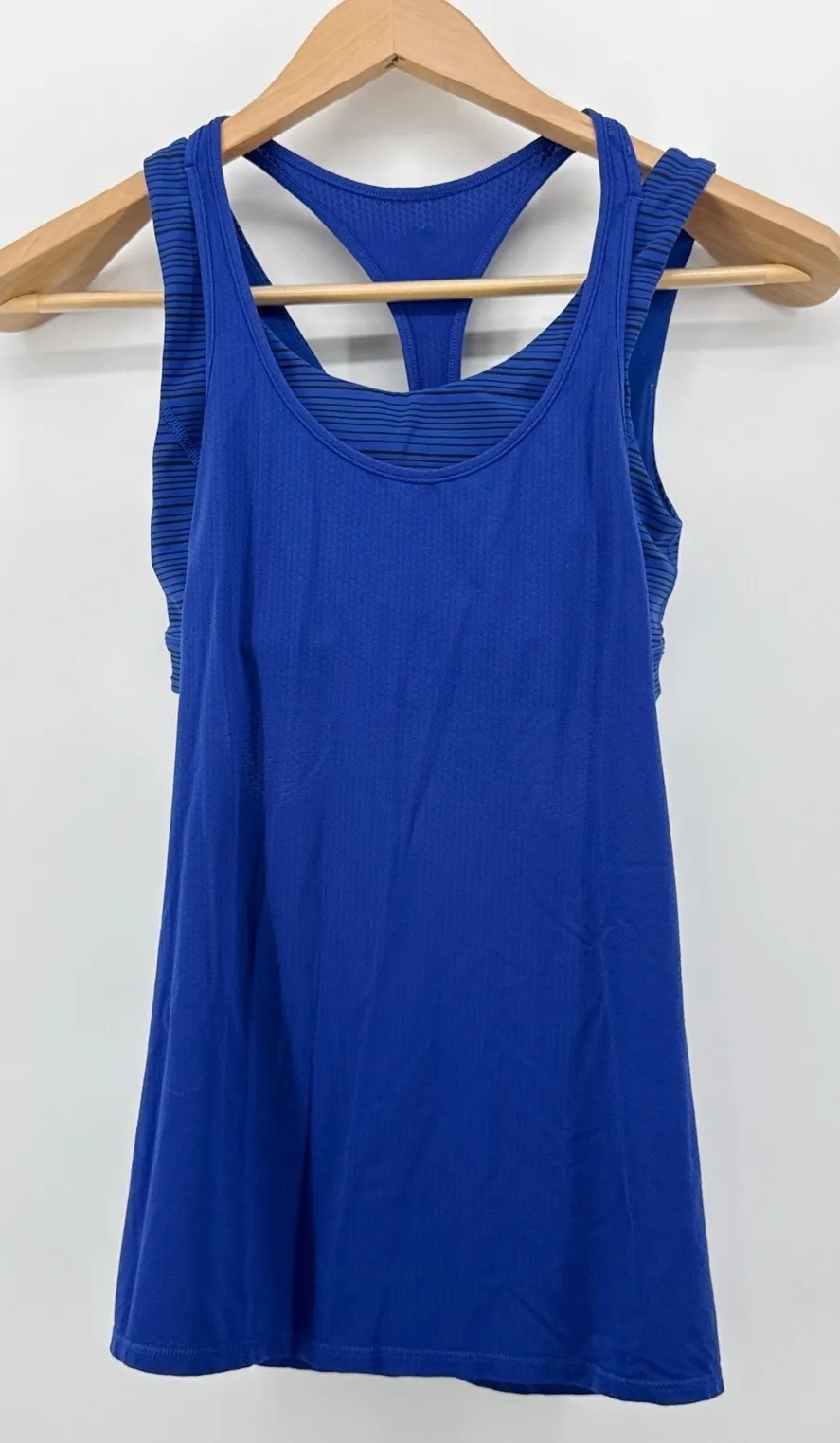 Keywords: Lululemon, workout tank, athletic top, exercise top, blue tank top, racerback tank, built in bra, sports bra top, running top, yoga top, gym top, striped tank, performance tank, activewear, womens top