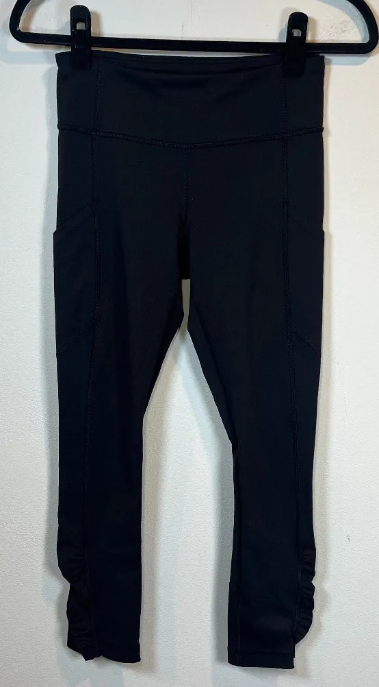 Lululemon Run Tempo Ruched Side Cropped Leggings Black Pull On Wide Compression Waistband 2 Side Poc... Show more