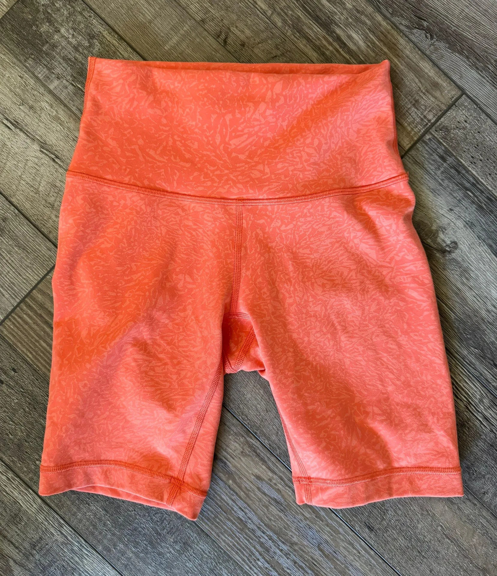 Orange designed shorts I would say they are an 8 inch inseam Great condition; no holes; no pilling