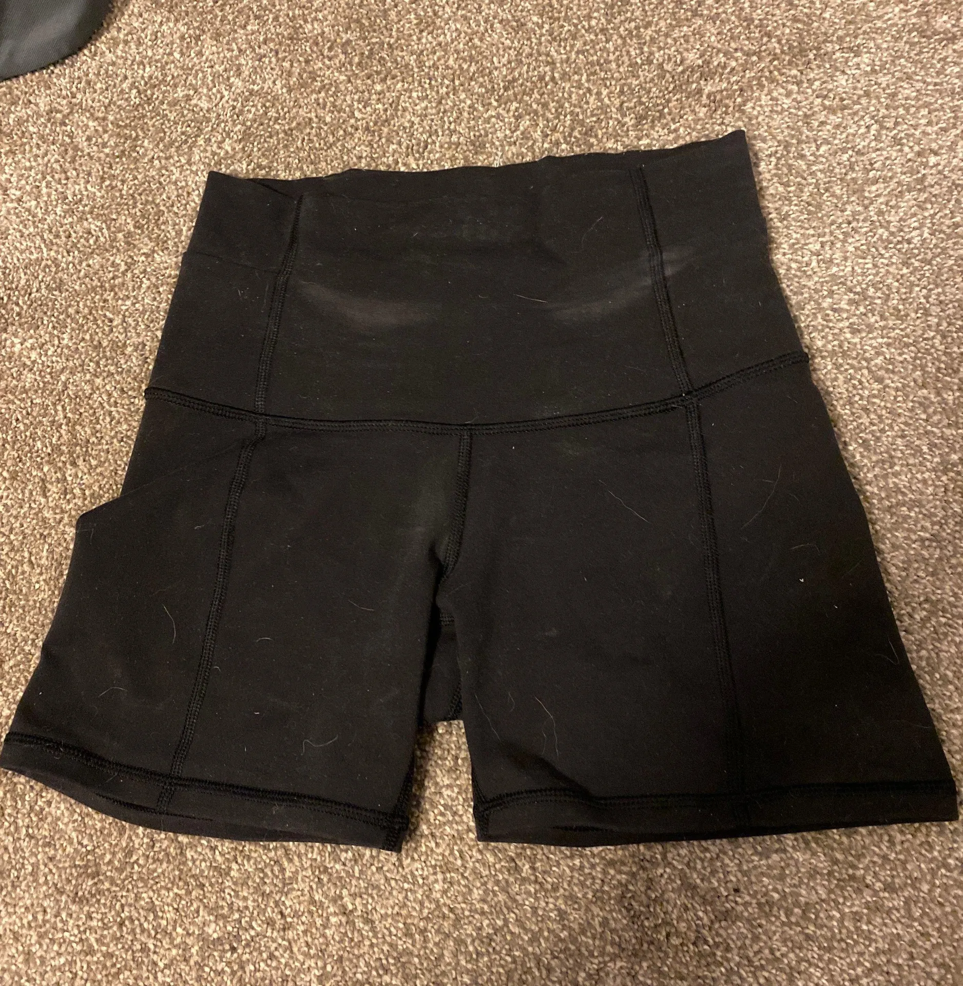 Size 4 black Lululemon biker shorts. Some light detergent staining that should disappear with anothe... Show more