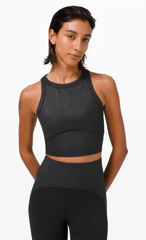 Blissful bend tank from Lululemon in distressed stripe emboss black, size 6. Worn but great conditio... Show more