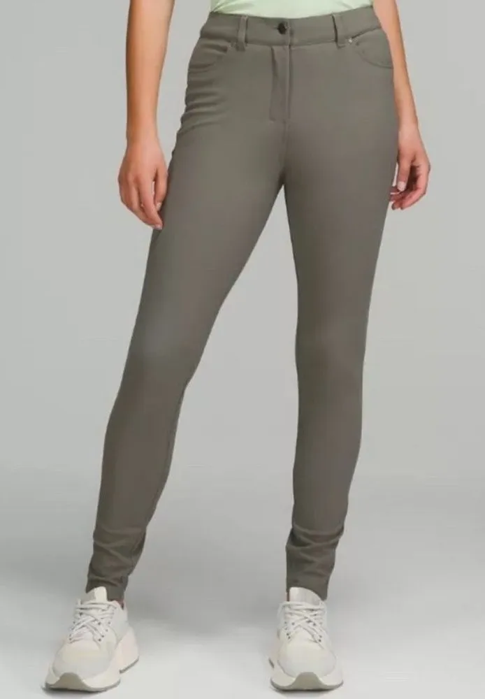 Elevate your workwear or casual outfit with these sleek Lululemon pants. The slim-fit, high-rise design is perfect for a flattering silhouette, while the knit fabric and pockets make them comfortable for everyday wear. These dress pants come in a solid grey sage color and have a full-length inseam of 30 inches. Ideal for travel, the office, or a casual day out, these pants are machine washable and have a waist size of 28 inches. The Lululemon City Sleek Slim-Fit 5 Pocket High-Rise Pant is made of polyester, nylon, and spandex, and has a flat front with a zip closure. Accented with buttons, zippers, and the Lululemon logo, these pants are perfect for a minimalist, sporty, or classic look.