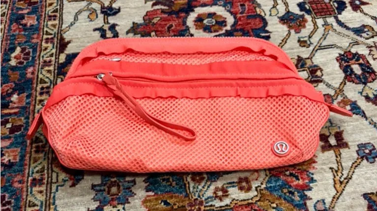 Lululemon mesh belt bag in a bright coral color featuring a lightweight, breathable design with zip... Show more