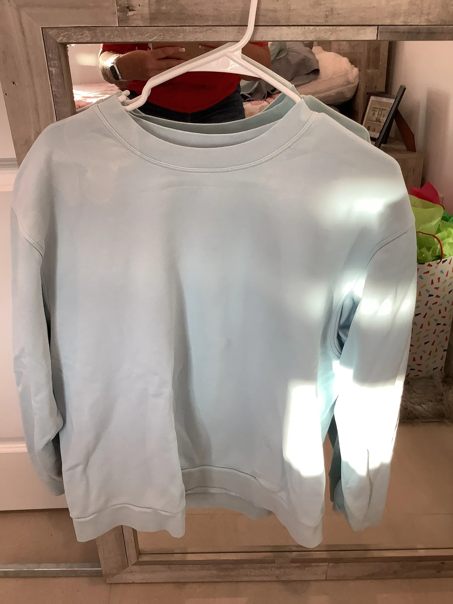Super cute light blue Lululemon crew neck. Some staining around the neck, not very noticeable, but p... Show more