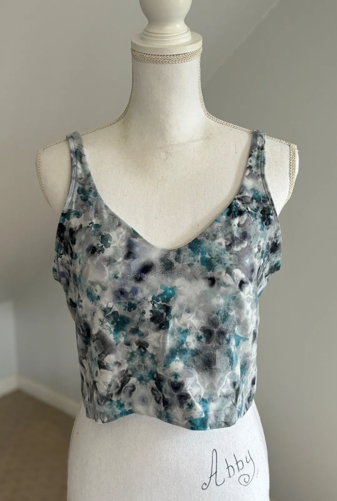 Keywords: Lululemon, crop tank, tank top, sleeveless, athletic, casual, floral print, size 14, workout top, yoga top, racerback, activewear, cropped tank, blue gray tank,