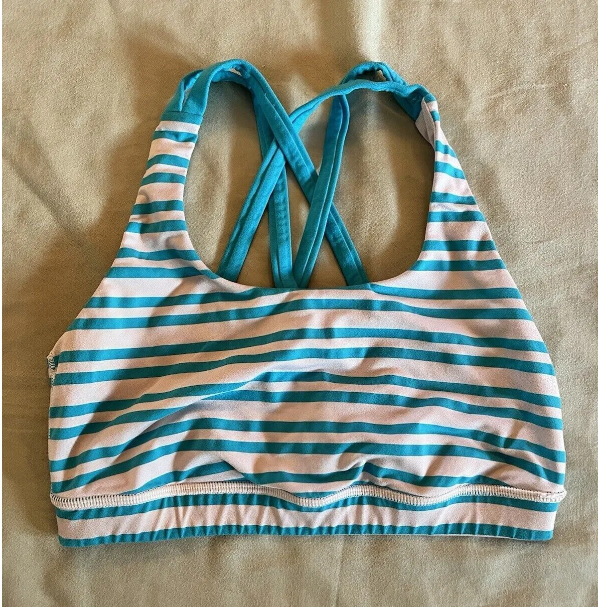 Elevate your activewear game with this Lululemon Energy Sports Bra in Spry Blue/White. The twin stri... Show more