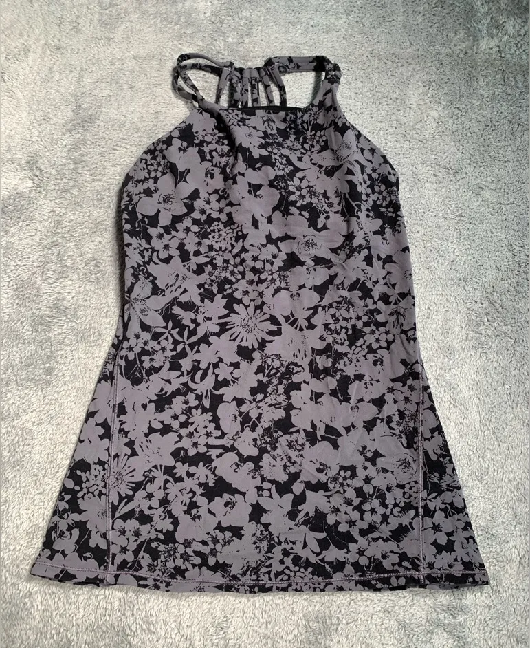 Stylish halter dress with a floral pattern. Features a black and gray color scheme.