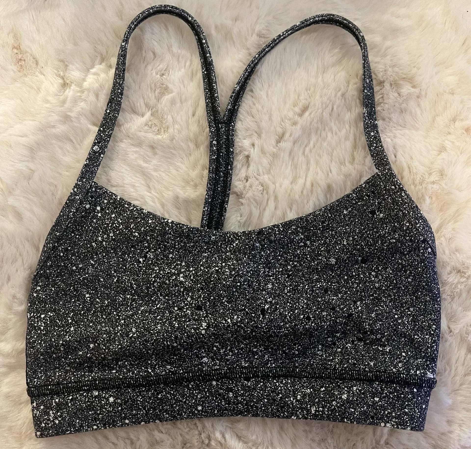 Black and white speck, worn once, great condition. Loved it just to small. I am a 34C