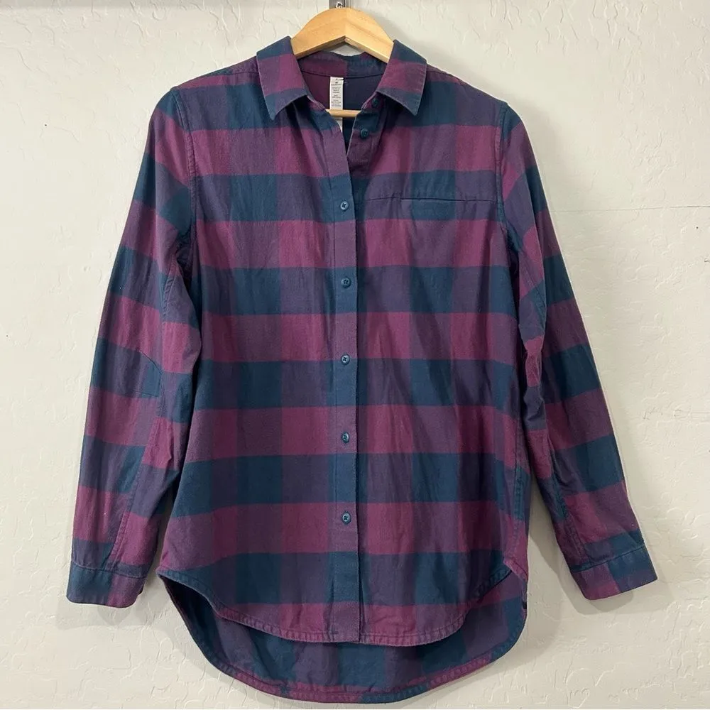Cozy and rare Lululemon Full Day Ahead Shirt in a beautiful purple and navy plaid. Features a button... Show more