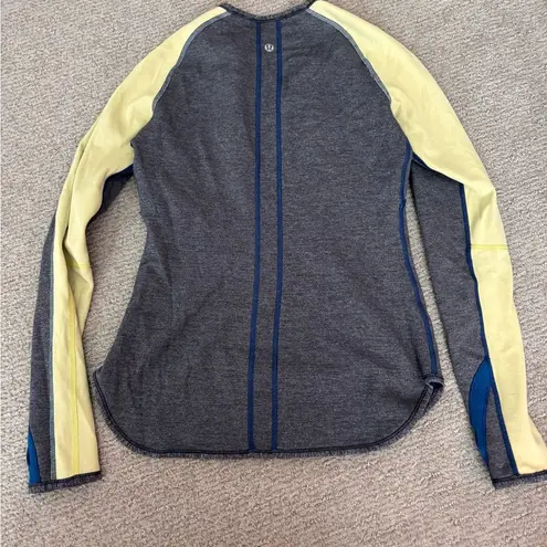 Stylish gray and yellow long sleeve top with blue accents. Perfect for casual wear.
