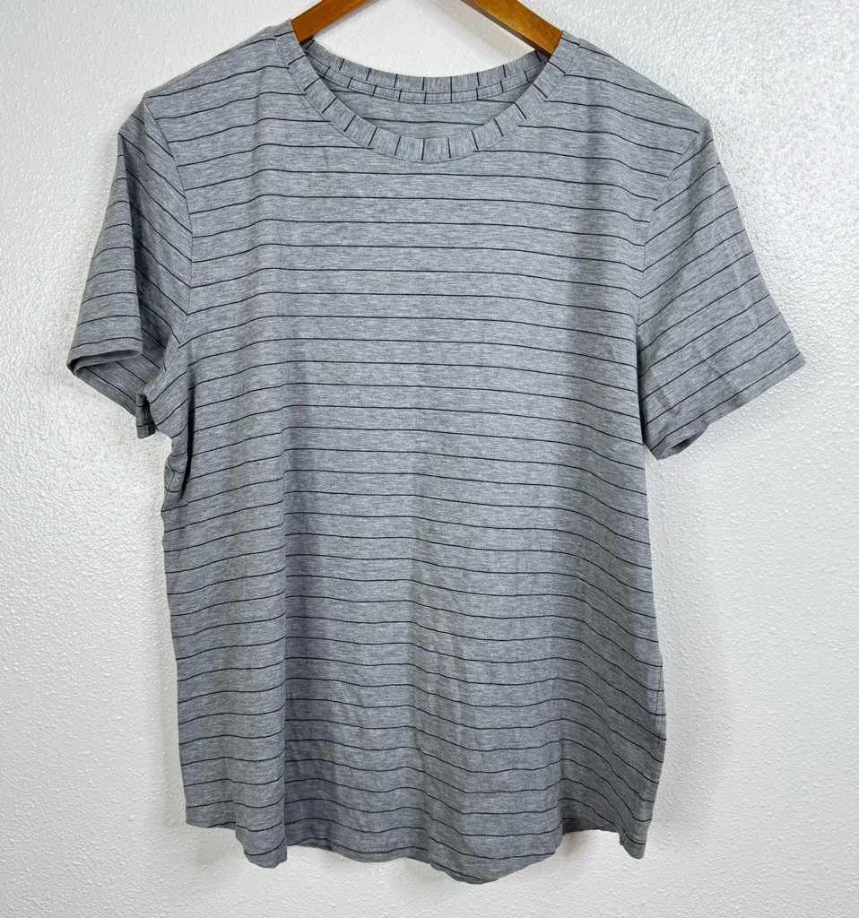 Lululemon Gray Striped Short Sleeve Shirt No size tag but measures approximately 21” pit to pit and... Show more