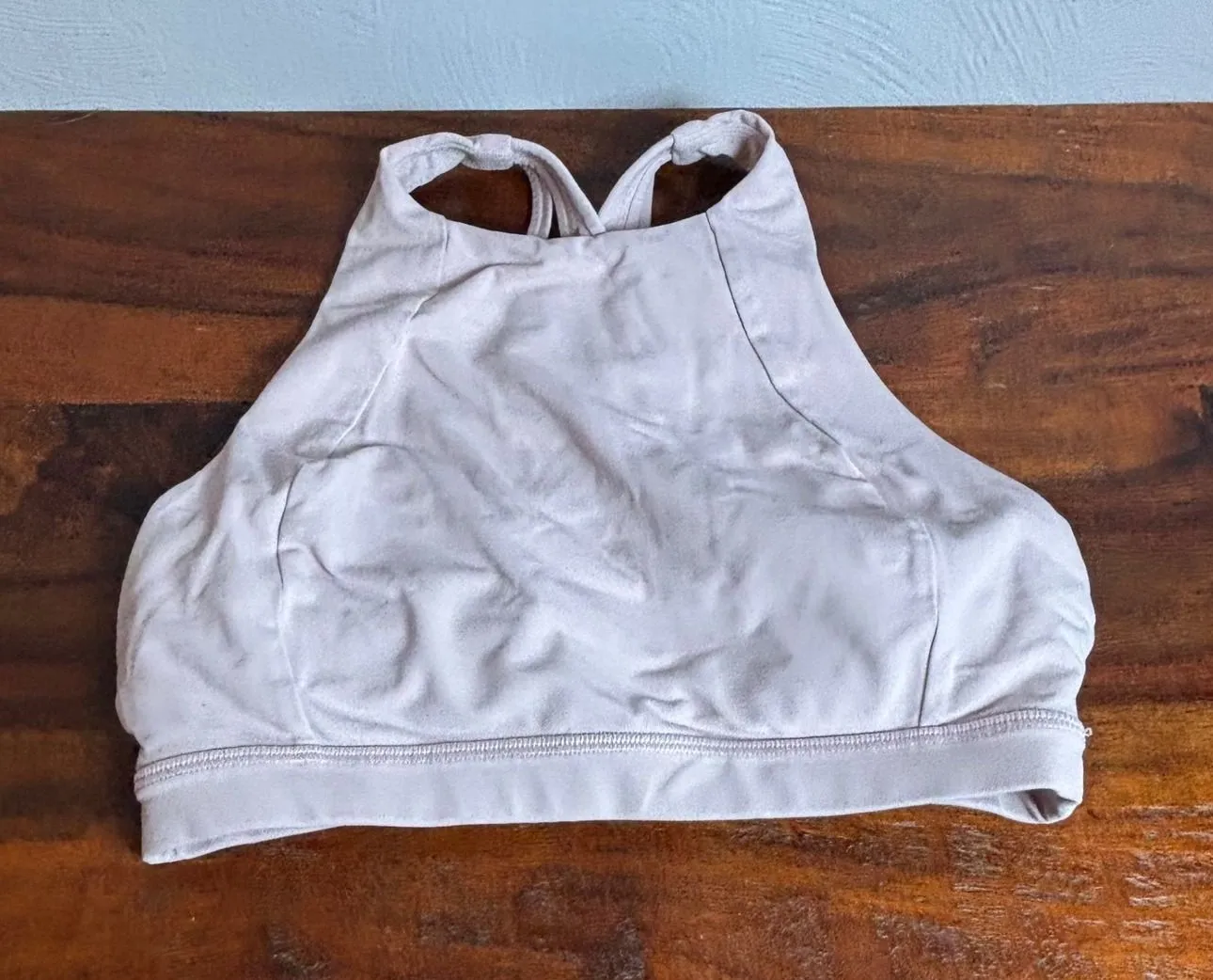 Lululemon high neck sports bra in a light pink hue. This athletic bra features a supportive high nec... Show more