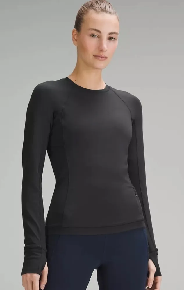 Lululemon It’s Rulu Long Sleeve Shirt in black. It has a zippered pocket on left side and has thumb... Show more