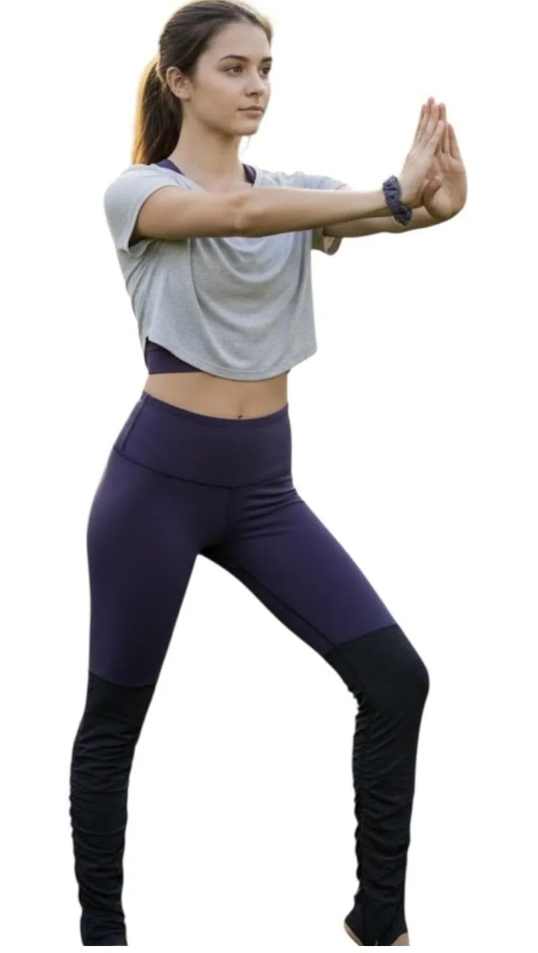 Brand: Lululemon Item: Womens leggings/yoga pants Size: 6 (estimated based on measurements shown in photos; size dot not visible) Color: Purple with black ruched lower-leg panels Features: High-rise wide waistband; full-length silhouette; ruched/shirred lower legs; contrast panel design; stretchy performance fabric Brand details: Lululemon logo at back waistband Style/Model: Not specified (inner size dot/style code not shown in photos) UPC/EAN: Not visible on item Notes: Measurement photos included to assist with fit; please compare to a similar pair.