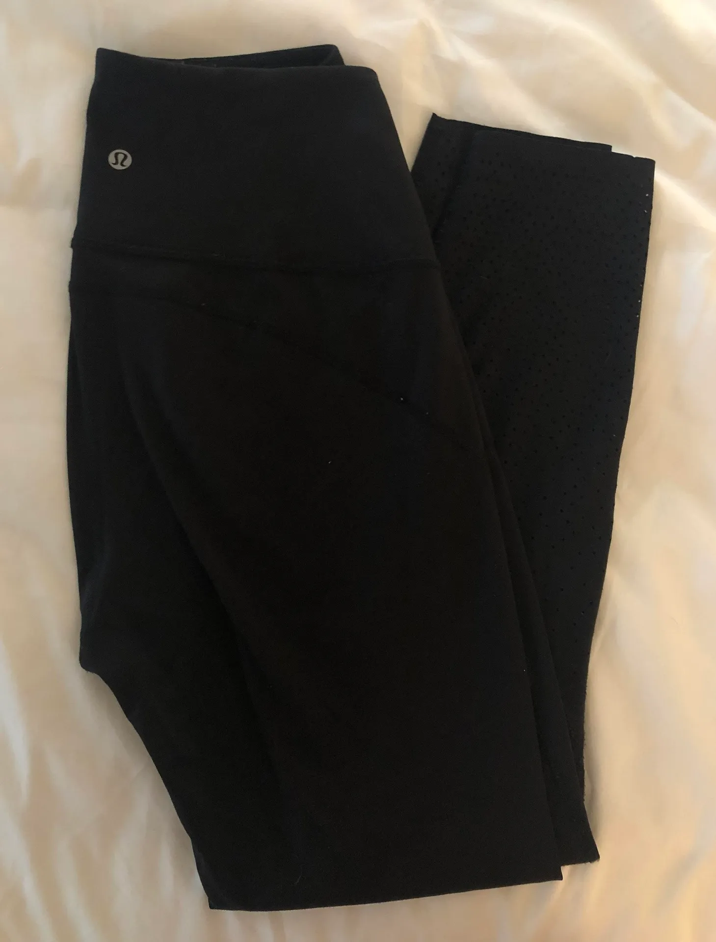 Black athletic material with laser cut holes on calves, 7/8 fit, slight pilling on inside of legging... Show more
