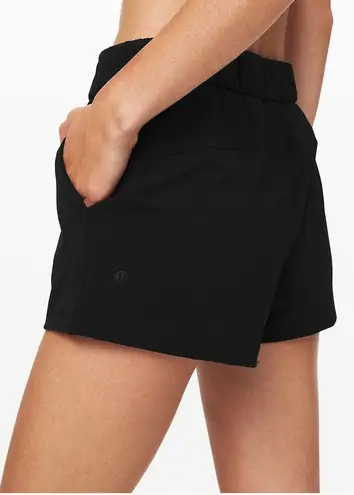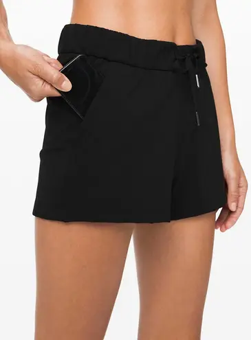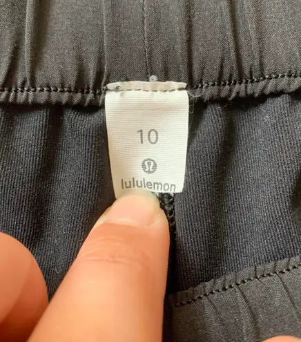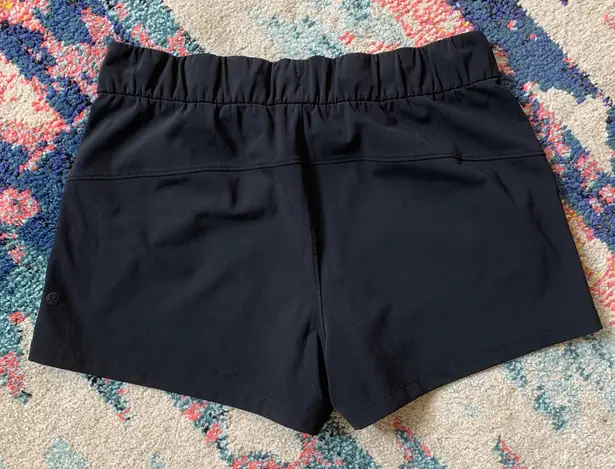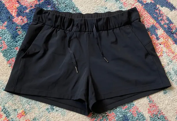 Size 10. Lululemon black On The Fly athletic shorts. Has 2 side pockets, draw string, and no lining!... Show more