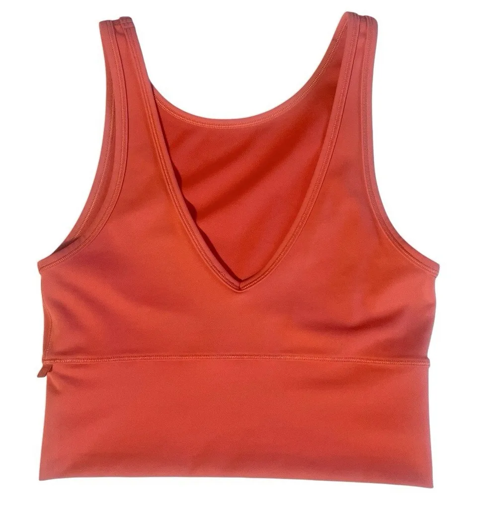 This sleek and vibrant orange tank top from Lululemon is the perfect addition to your activewear wardrobe. Featuring a deep V-neck and built-in shelf bra, it offers both style and support for yoga, gym, or casual wear. While the size tag is missing, based on measurements and fit, it's estimated to be a size 4 or 6.