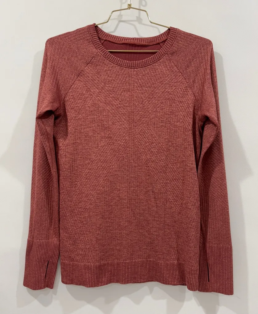 Excellent condition, Lululemon Rest Less Pullover Top Size 10/12 Heathered Mulled Wine/Pink Savannah Powered by seamless technology, this cozy, sweat-wicking layer was designed to be worn under your raincoat on wet commutes or under your ski jacket when hitting the slopes. Seamless construction minimizes chafing Fabric is sweat-wicking and four-way stretch Features Designed for: Run Thumbholes: Thumbholes help keep your sleeves down for easy layering Fit : Body Skimming, hip length Pit to pit, 19" Length, 27" raglan sleeve Perfect for casual wear.