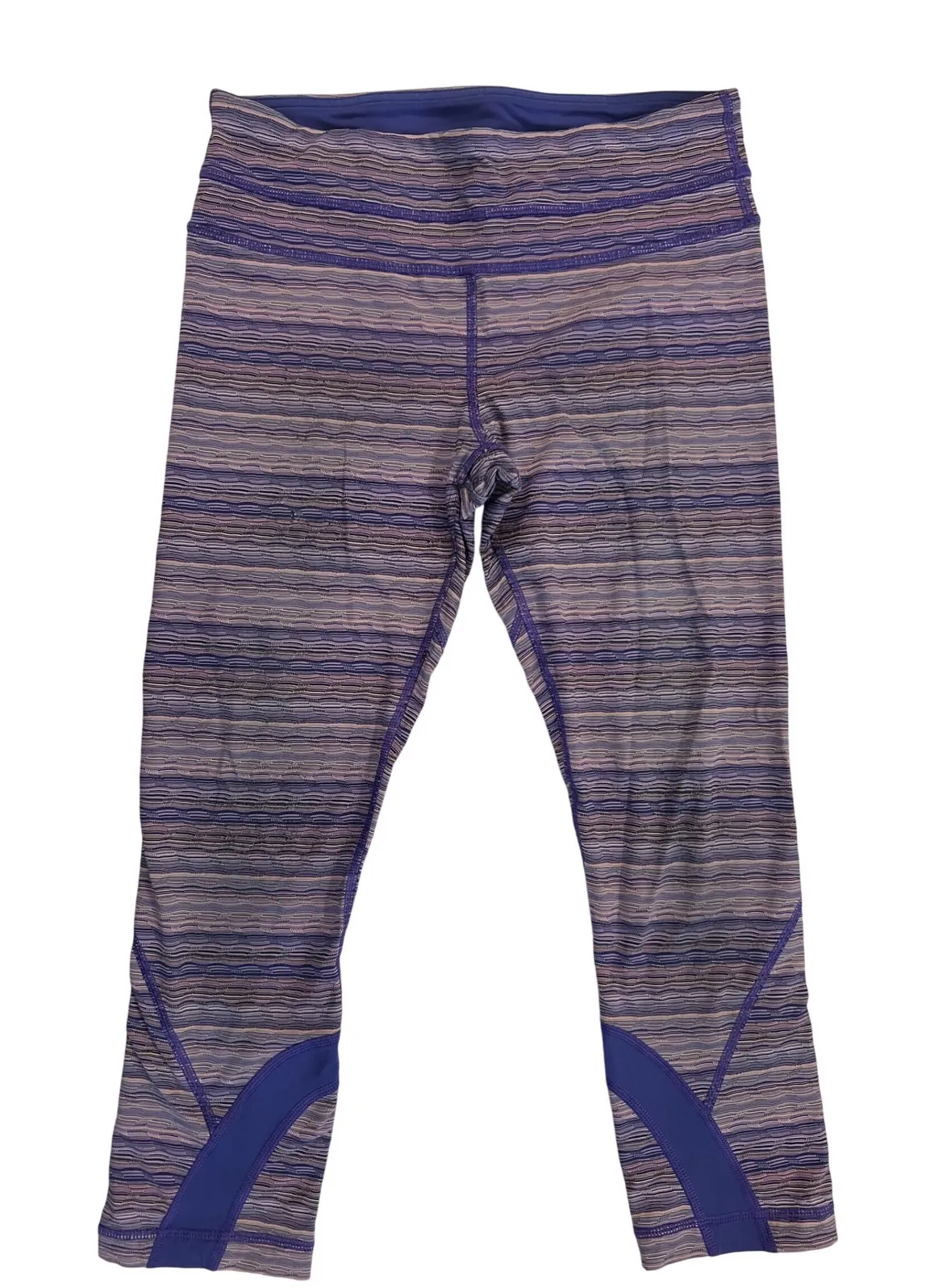 Elevated comfort meets performance in these Lululemon crop leggings. Featuring a captivating striped design in shades of purple, these leggings are a stylish addition to your activewear collection. The solid blue accents at the hem add a pop of color and visual interest. Designed for a flattering fit, they offer a comfortable waistband and a cropped length that's perfect for warmer weather or layering. Wear these leggings for yoga, pilates, or hitting the gym.