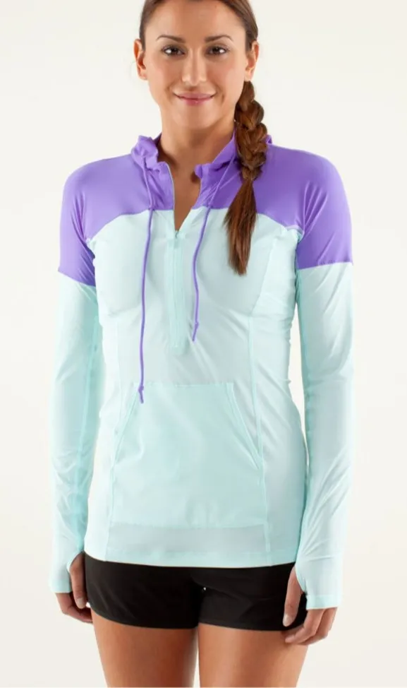 Excellent condition Pit to pit 15 in Length 24 in Long sleeve with thumbholes Hooded with hole for ponytail/hair to go through Fabric is light and stretchy Pockets Color is aquamarine/power purple Tags: athleisure, athletic, running, gym, workout, activewear, casual, fitness, colorful