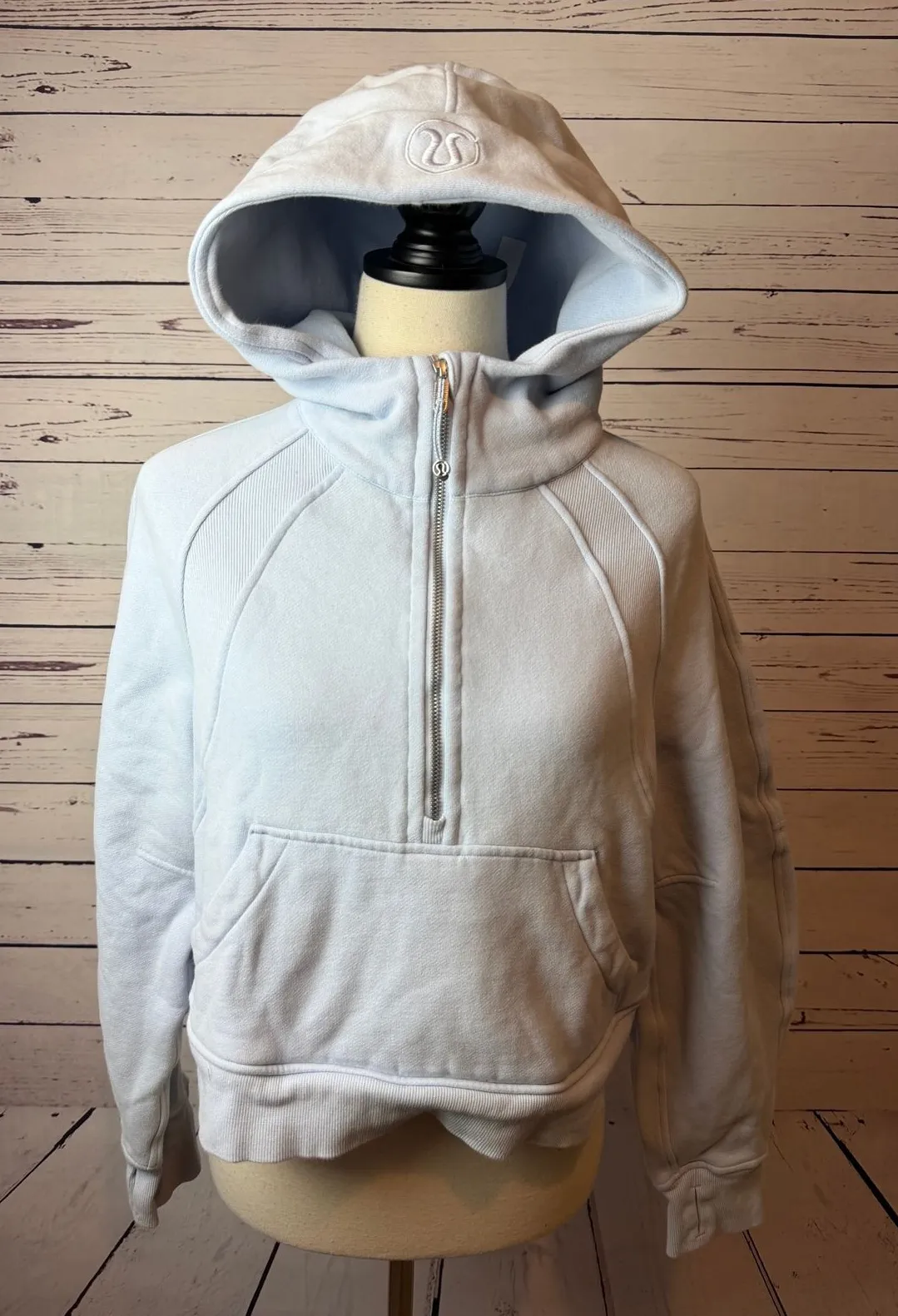 A light blue Lululemon Scuba hoodie with a quarter-zip closure. Item lw3dm4s Oversized half zip athletic inspired top features a cozy hood w Lululemon logo, kangaroo pocket, and ribbed cuffs with thumbholes for warmth and comfort.