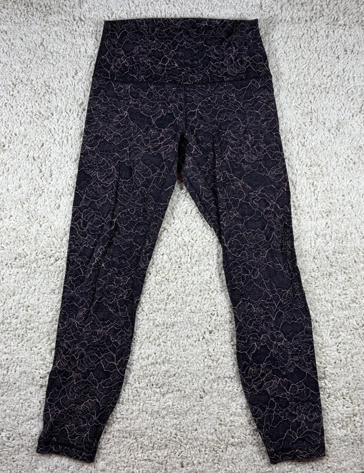 Embrace your active lifestyle with these Lululemon Align leggings, designed to move with you. The captivating black and pink lace-inspired print adds a touch of feminine flair, while the high-rise waist offers comfortable support. Perfect for your yoga practice or a stylish athleisure look, these leggings will become a go-to favorite for studio sessions or running errands.