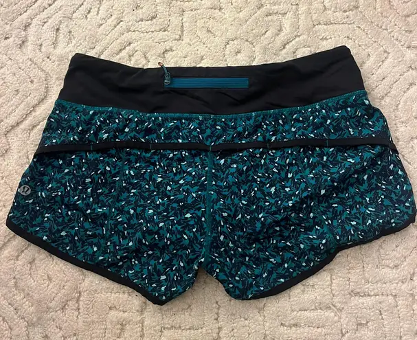 Size 6, green pattern lululemon shorts in green pattern. 2.5” inseam in good condition!