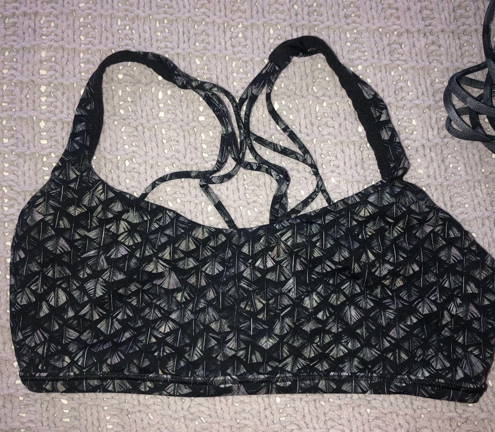 Black sports bra with string on the back. Fits smaller than 6– fits more like a 2-4
