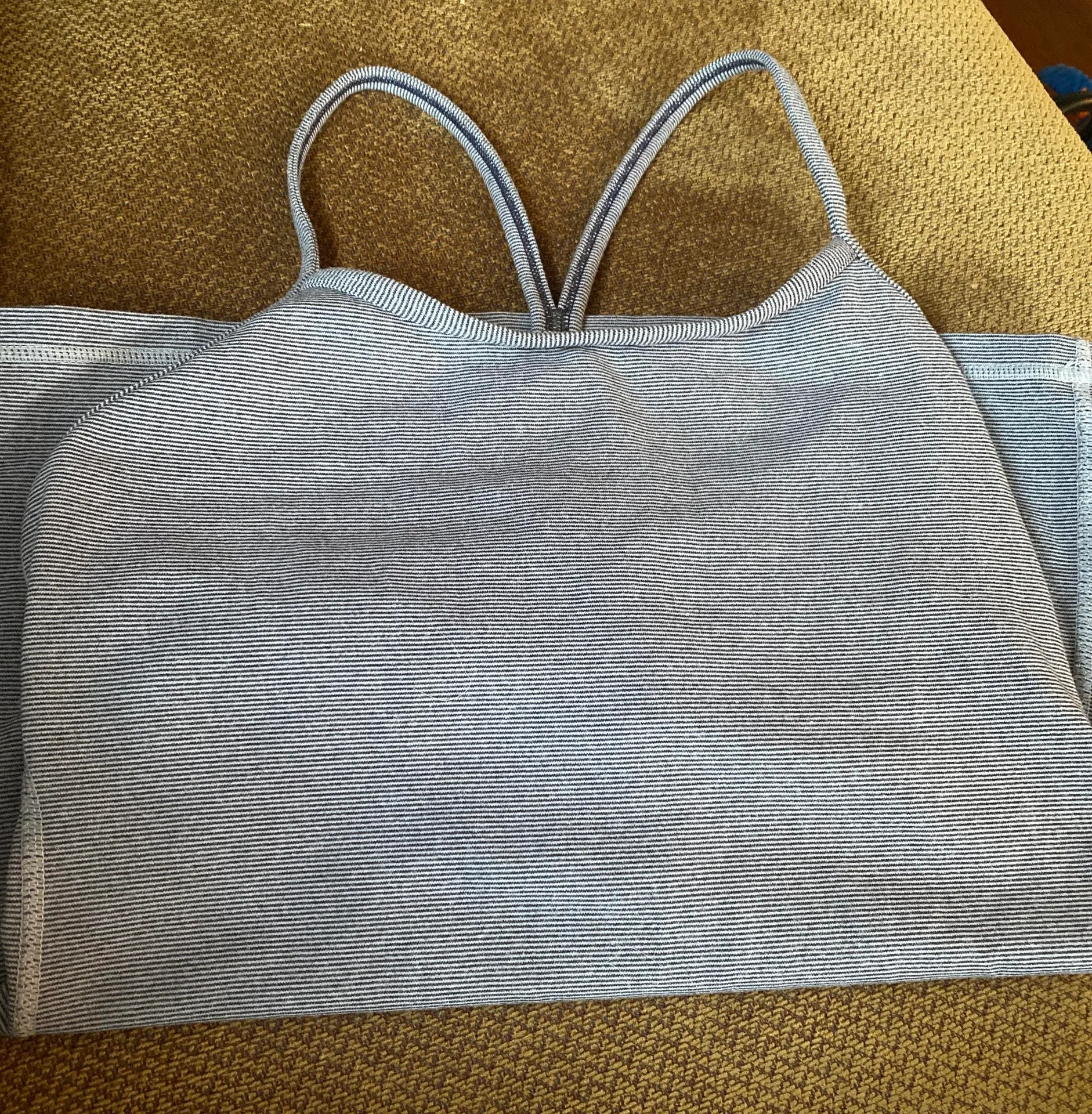 Lululemon tank top purple/gray striped. Has a built in bra. Unsure of size either a 4/6 I’ve had it... Show more